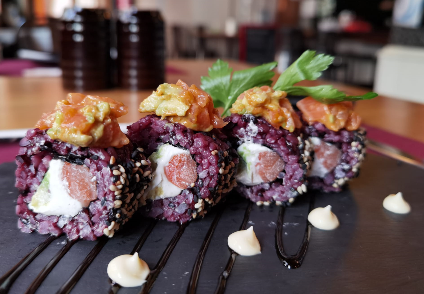 - Uramaki de cangrejo, aguacate, pepino y cebolla frita por encima